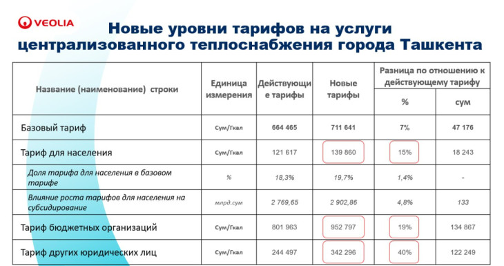 Напомним, Ташкентский городской кенгаш народных депутатов одобрил предложение компании Veolia Energy Tashkent о повышении тарифов на услуги центрального отопления и горячего водоснабжения в августе этого года.