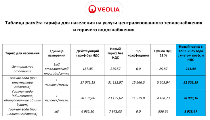 Согласно документу, с 12 ноября 2025 года тарифы (без НДС) составят: