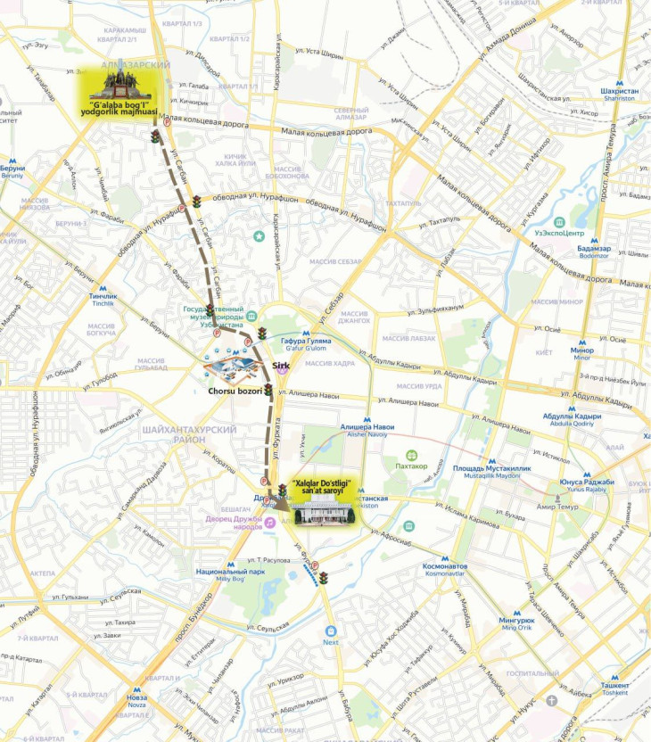 Парад начнется в 15:00 с показательного выступления в мемориальном комплексе «Парк Победы». Воинские подразделения пройдут по маршруту: Мемориальный комплекс «Парк Победы» (через улицы Сагбон и Заркайнар) – Государственный музей природы Узбекистана – рынок «Чорсу» – Ташкентский цирк (улица Заркайнар) – Дворец искусств «Дружба народов» (проспект Узбекистан и улица Фурката).