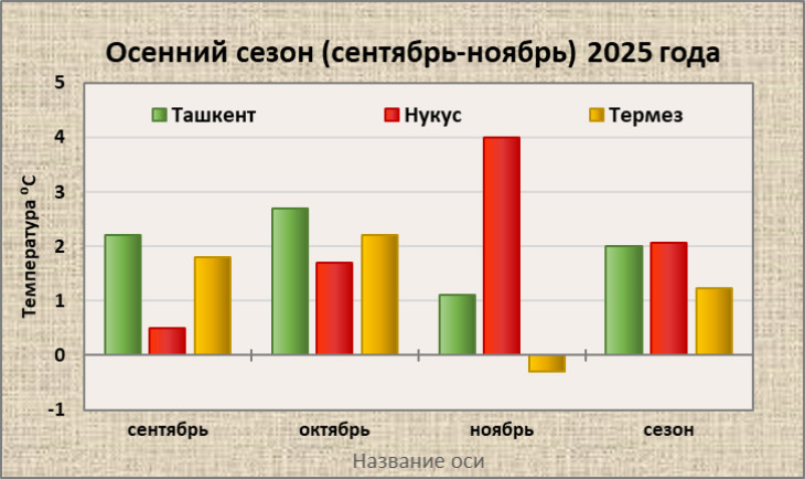 Таким образом, эта осень вошла в пятерку самых сухих осенних сезонов за весь период наблюдений. Лишь в центральных и южных районах Каракалпакстана количество осадков за сезон составило 40-80 % от нормы, а в северных районах 95-222 %.