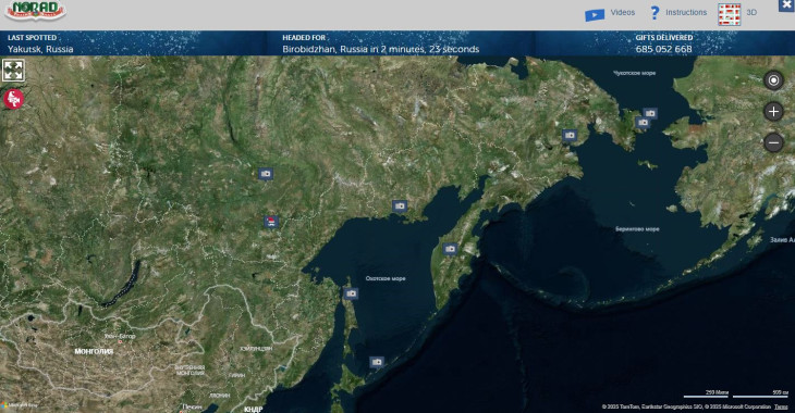Согласно этим данным, Санта-Клаус покинул Северный полюс в 12:00 по ташкентскому времени. Санта передвигается на своих волшебных санях, запряженных девятью оленями, во главе которых - знаменитый олень Рудольф. К настоящему моменту уже доставлено более 685 млн подарков.