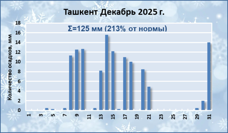 Месячное количество осадков по большинству областей составило 150-300 % от нормы. Лишь по Хорезмской области, большей части Бухарской, Навоийской областей осадков выпало меньше и около нормы. По Ташкентской области, в отдельных районах Сырдарьинской, Джизакской, Самаркандской областей декабрь оказался самым осадочным за последние 25 лет.