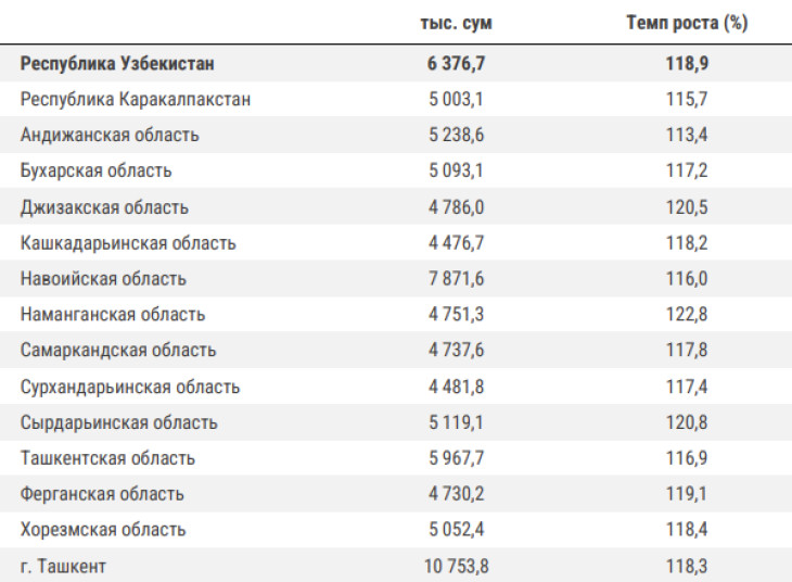 Наибольший темп роста средней номинальной заработной платы по видам экономической деятельности был зафиксирован в сфере искусства, развлечений и отдыха. В этой области зарплата выросла на 26,4 % по сравнению с аналогичным периодом 2024 года и составила 5 448 200 сумов, что является самым высоким показателем среди всех секторов. Также в сфере образования заработная плата выросла на 20,1 % и составила 4 372 000 сумов.
