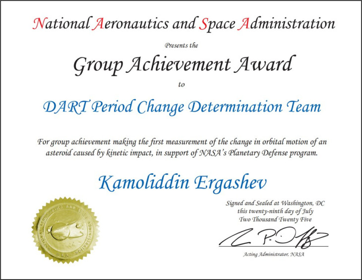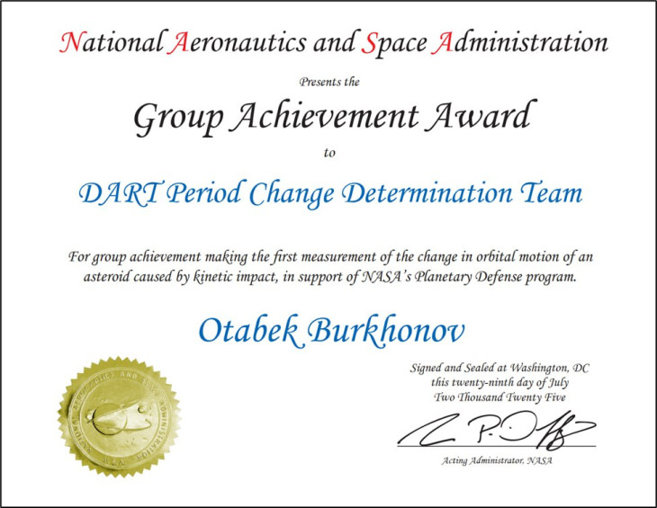 По данным научного ведомства, кандидат наук Отабек Бурхонов, заведующий Лабораторией галактической астрономии, и кандидат наук Камолиддин Эргашев, старший научный сотрудник, были награждены NASA«Групповой премией за достижения». Награда присуждена за исторический научный результат, достигнутый в рамках международной космической миссии «Испытание двойного изменения направления астероида» (DART).