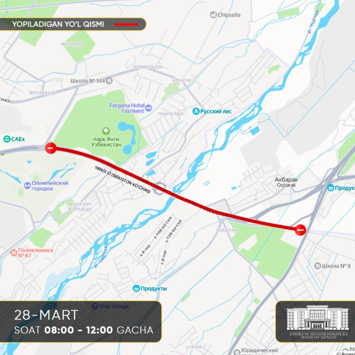- улица Янги Узбекистон - от участка напротив университета CAU до Паркентской автомагистрали;