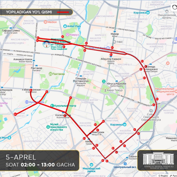 О временном ограничении движения транспортных средств на ряде улиц Тащкента сообщили в среду в хокимияте столицы. Причина - проведение чемпионата Узбекистана по дуатлону, а также мероприятий International Tashkent Marathon 2026.