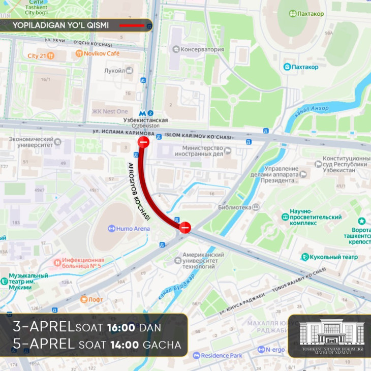- улица Шахрисабз - от перекрестка с улицей Афросиаб до проспекта Амира Темура;
