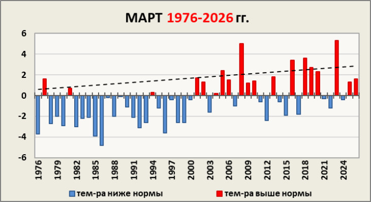 При этом отмечается, что максимальная температура воздуха в марте 2026 года не достигла своих рекордных значений.